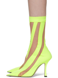 Ankle-high paneled lycra and stretch nylon tulle boots in yellow and beige. · Pointed toe · Leather lining · Covered stiletto heel · Rubber injection at toe and heel · Leather sole in beige · Heel: H4 in Part of the Jimmy Choo x Mugler collaboration. Supplier color: Neon yellow Upper: textile. Sole: leather. Made in Italy 221528F113028