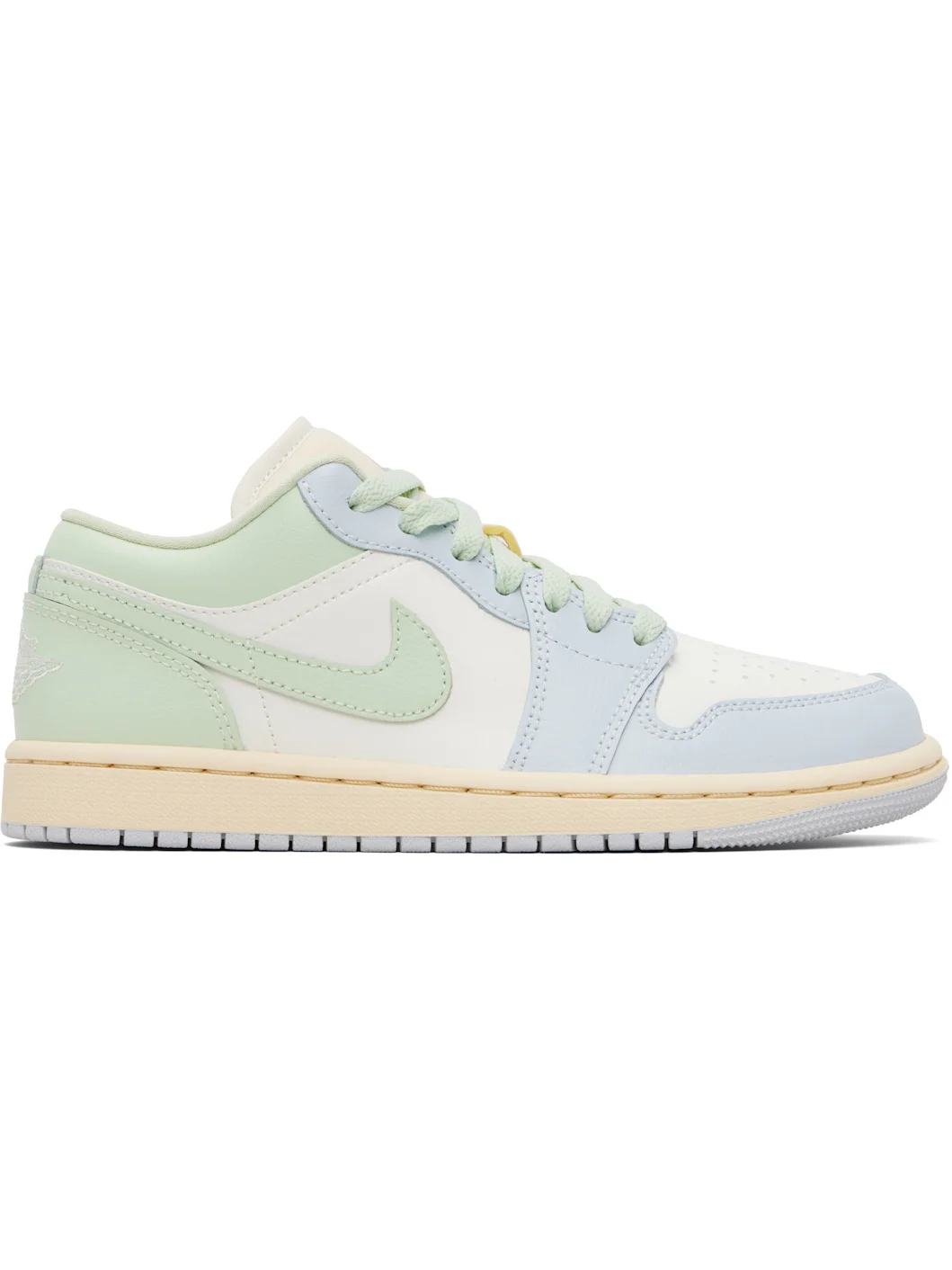 Low-top grained leather sneakers. · Perforated detailing at toe · Lace-up closure · Logo embroidered at tongue and heel counter · Padded tongue and collar · Swoosh applique at sides · Mesh lining · Air unit at foam midsole · Treaded rubber sole Please note that this item may be shipped only within North America. Supplier color: Sail/Aura/Muslin/Jade Aura Upper: leather, synthetic. Sole: rubber. Made in Viet Nam 261445F128009