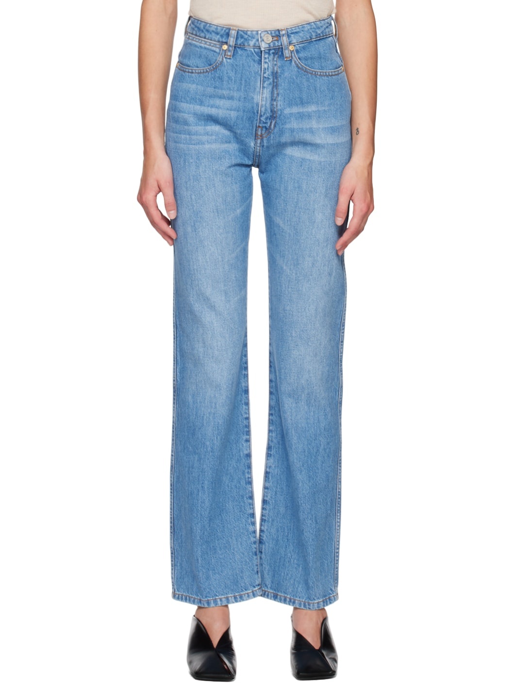 Straight-leg non-stretch denim jeans. Fading and whiskering throughout. · High-rise · Belt loops · Five-pocket styling · Zip-fly · Leather logo patch at back waistband · Contrast stitching in tan Supplier color: Indigo wash 100% cotton. Made in Tunisia 231936F069001