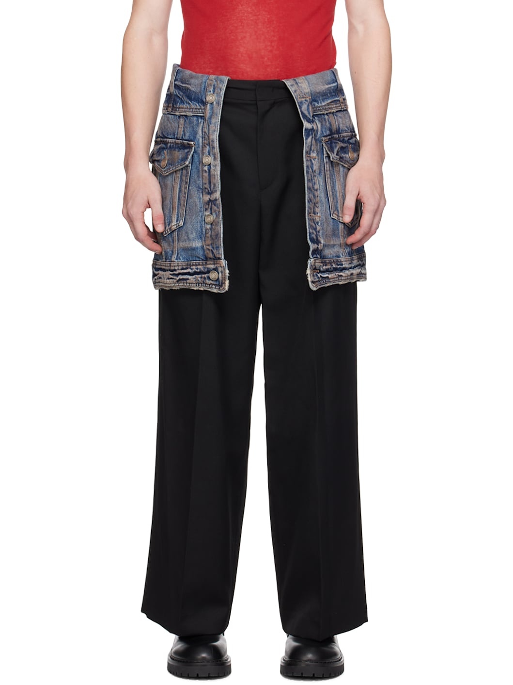 Wool twill trousers. Detachable skirt-style non-stretch denim overlay. · Belt loops · Four-pocket styling · Zip-fly · Pleats at front · Creased legs Supplier color: Black Body 1: 100% wool. Body 2: 100% cotton. Made in South Korea 242343M191012