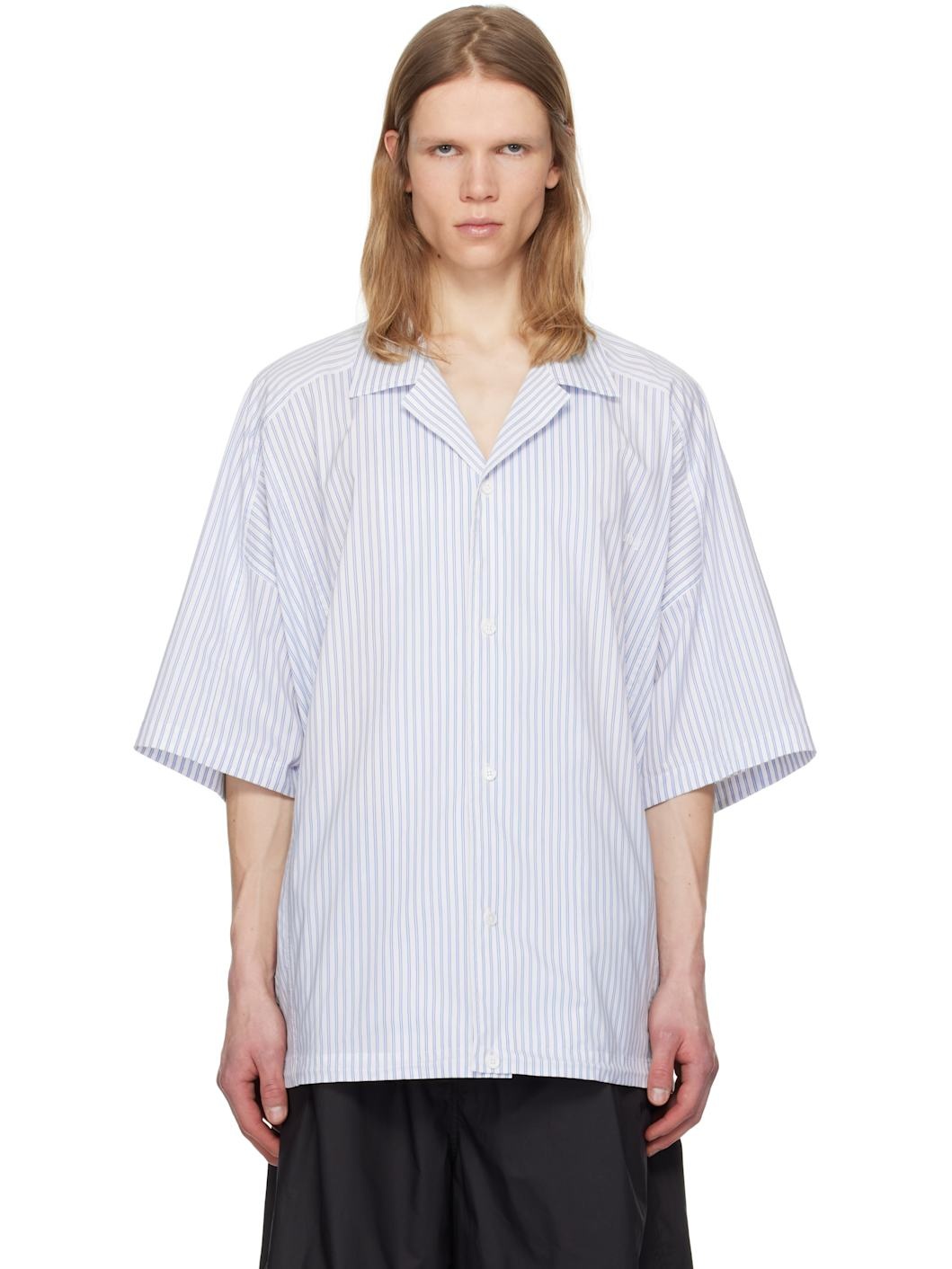 Cotton-blend poplin shirt. Stripes throughout. · Open spread collar · Button closure · Embroidered logo at chest · Concealed bungee-style drawstring at hem · Dropped saddle shoulders Supplier color: Blue 59% cotton, 41% polyester. Made in South Korea 251343M192027