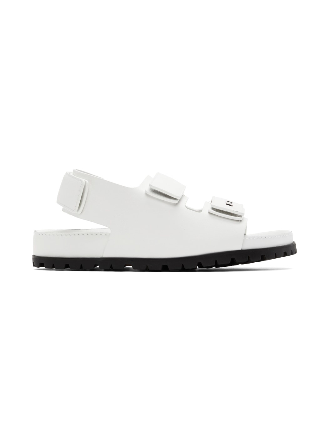 Buffed leather sandals in white. · Open round toe · Velcro straps and logo hardware at vamp · Velcro slingback strap · Logo-embossed leather patch at molded leather footbed · Treaded rubber sole Supplier color: White Upper: leather. Sole: rubber. Made in South Korea 221343F124002