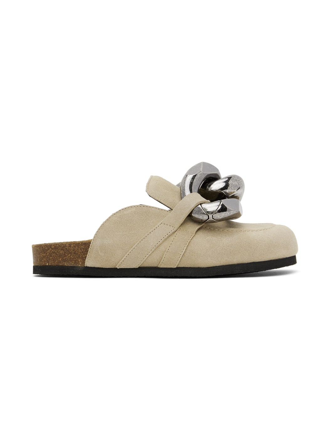 Calfskin suede slip-on loafers in beige. · Moc toe · Sculptural curb chain hardware at vamp · Padded tongue · Grained sheepskin lining · Leather logo patch at molded footbed · Cork midsole · Crepe rubber outsole · Antiqued silver-tone hardware Supplier color: Beige