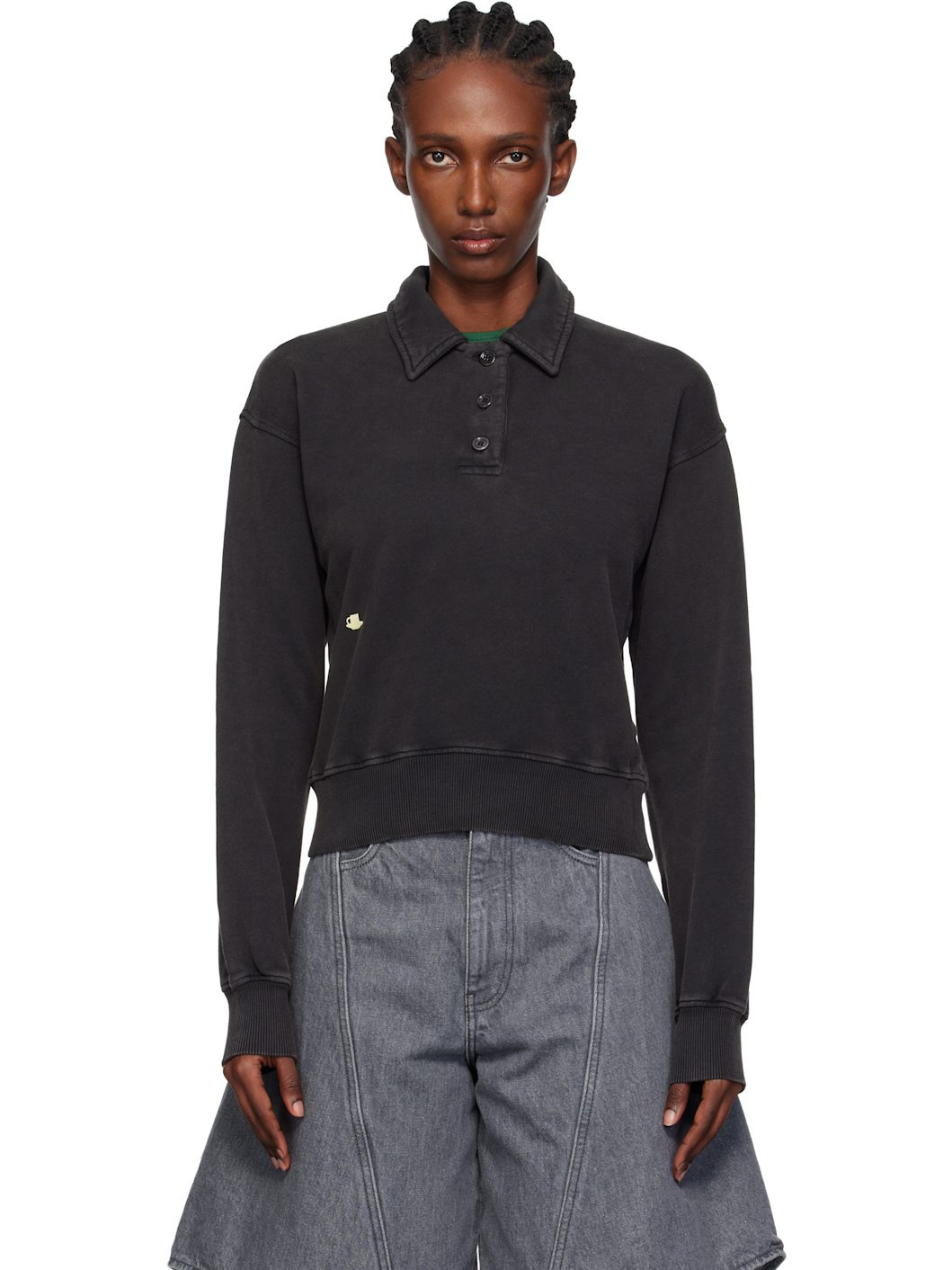 French terry polo. · Fading throughout · Spread collar · Three-button placket · Graphic embroidered at front · Rib-knit hem and cuffs · Logo embroidered at back Supplier color: Washed black Body: 100% cotton. Trim: 98% cotton, 2% elastane. Made in Portugal 252477F108003