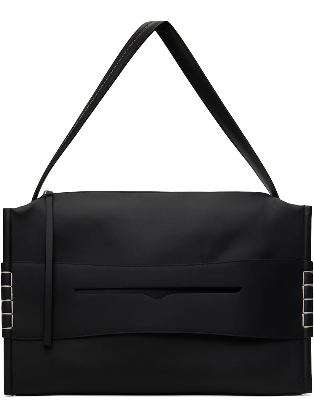 Grained calfskin top handle bag in black. · Fixed shoulder strap · Strap with cutout at face · Logo bonded at back · Zip closure · Patch pocket at interior · Suede lining · Silver-tone hardware · Contrast stitching in white · H12" x W18.5" x D6.5" Supplier color: Black 100% calfskin. Made in Italy 251477F046004