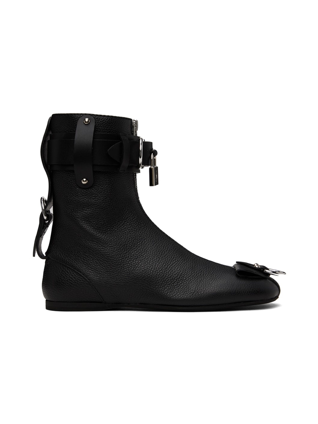 Ankle-high grained calfskin boots in black. D-rings throughout. · Zip closure · Pin-buckle ankle strap · Logo-engraved padlock hardware at collar · Pull-loop at heel tab and collar · Strap at heel counter · Grained sheepskin lining · Rubber sole · Silver-tone hardware Supplier color: Black