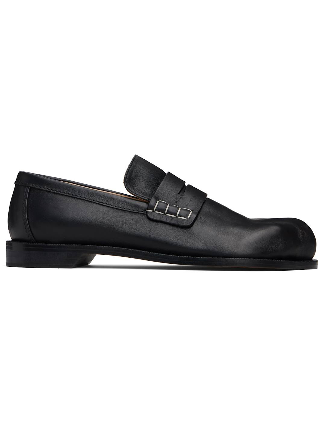 Grained leather loafers. · Modified molded toe · Strap with cutout at vamp · Calfskin lining · Stacked leather midsole · Calfskin sole with rubber injection · Contrast blanket stitching in white Supplier color: Black Upper: leather. Sole: calfskin, leather, rubber. Made in Italy 252477M231001