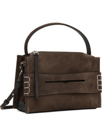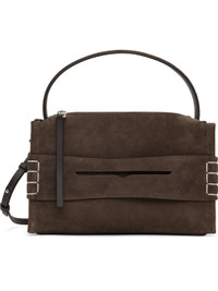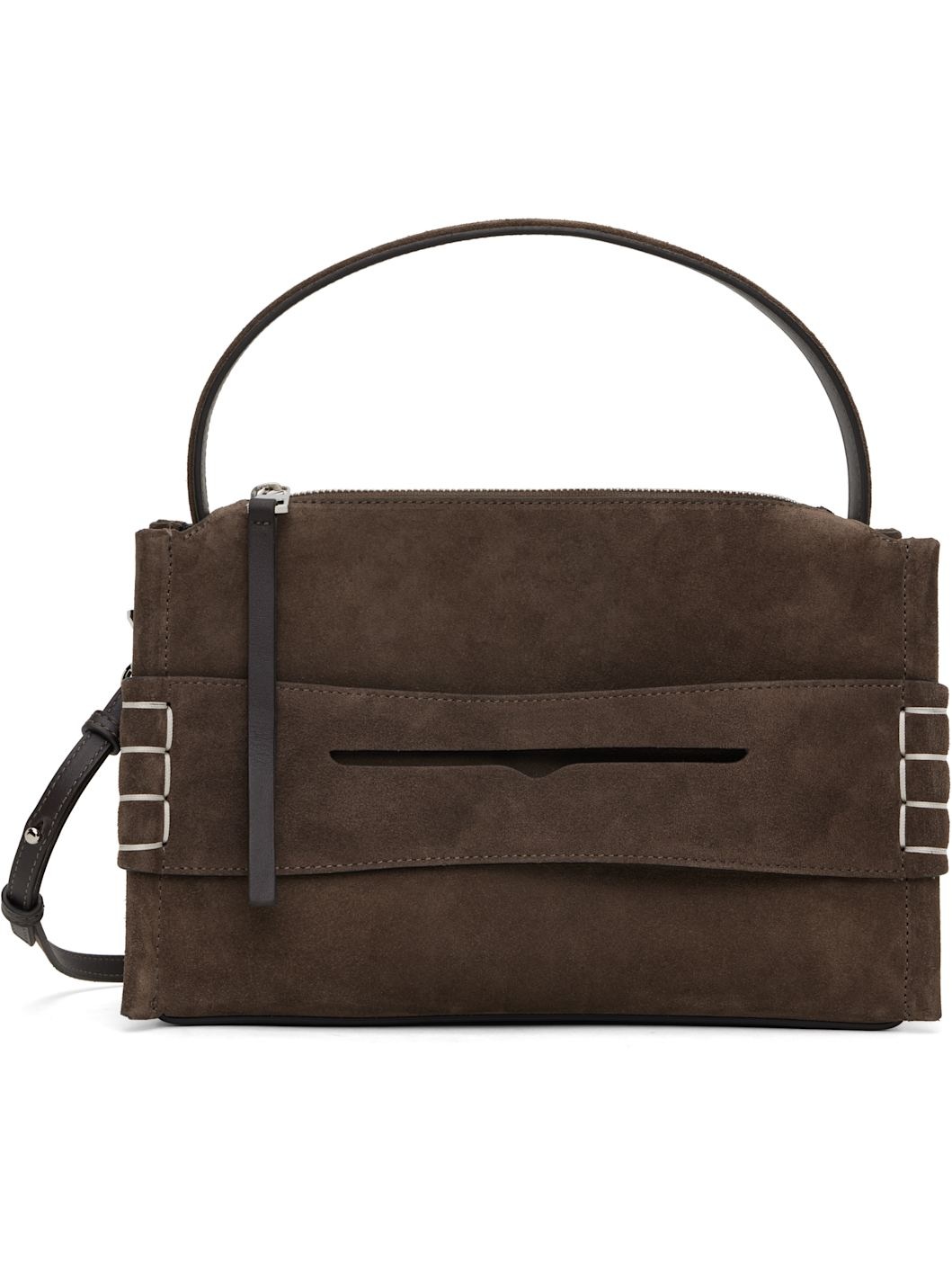 Calfskin suede shoulder bag in brown. · Fixed shoulder strap · Adjustable and detachable crossbody strap · Loafer-style strap at face · Logo embossed at back face · Zip closure · Patch pocket at interior · Logo-engraved silver-tone hardware · H7" x W11" x D3.5" Supplier color: Brown Calfskin. Made in Italy 251477F048008