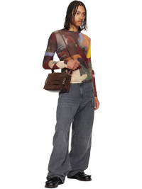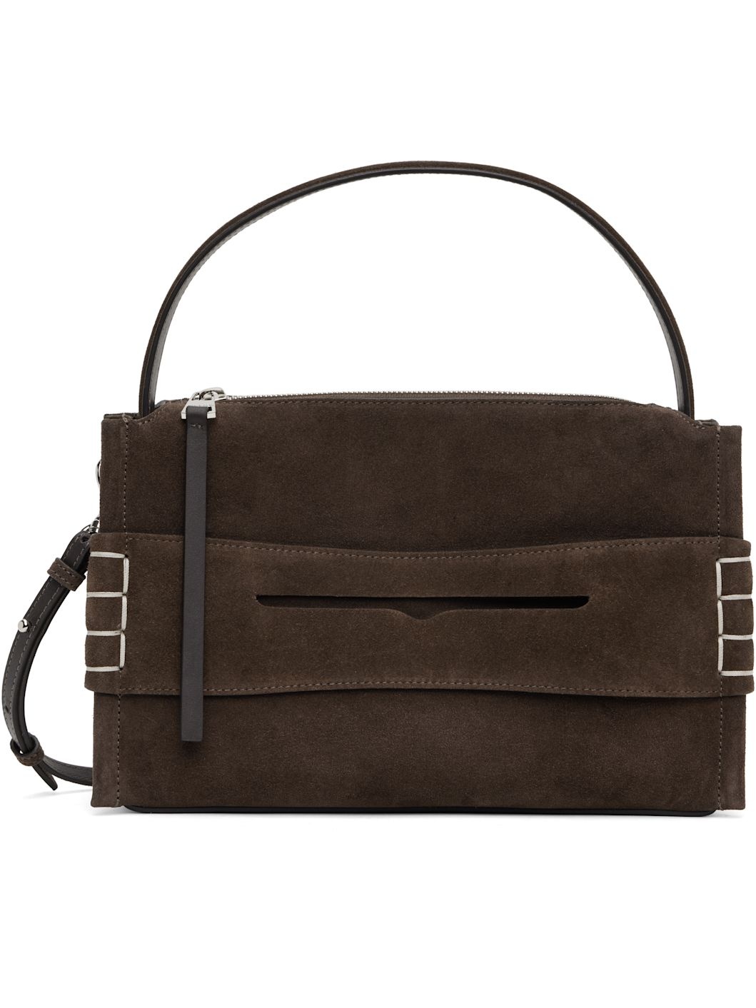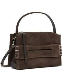Calfskin suede messenger bag in brown. · Fixed shoulder strap · Adjustable and detachable crossbody strap · Loafer-style strap at face · Logo embossed at back face · Zip closure · Patch pocket at interior · Logo-engraved silver-tone hardware · H7" x W11" x D3.5" Supplier color: Brown Calfskin. Made in Italy 251477M170000