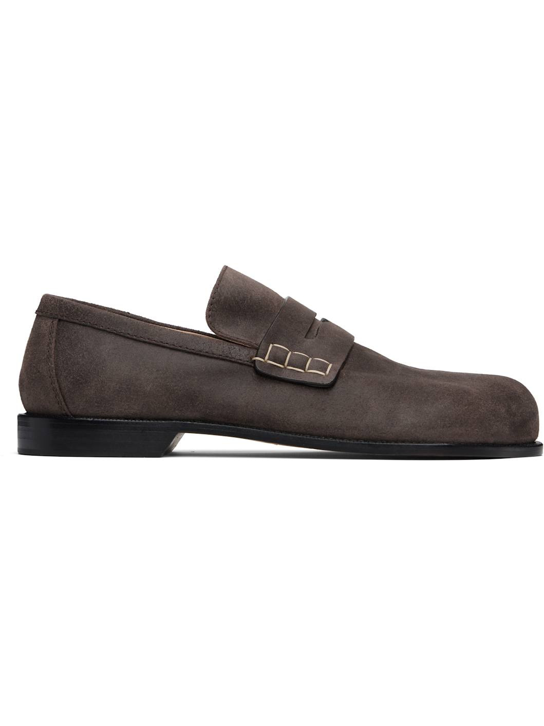 Blistered suede loafers. · Modified molded toe · Strap with cutout at vamp · Calfskin lining · Serrated edges at welt · Stacked leather midsole · Calfskin sole with rubber injection · Contrast blanket stitching in white Supplier color: Deep walnut Upper: leather. Sole: calfskin, leather, rubber. Made in Italy 252477F121002