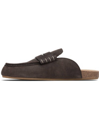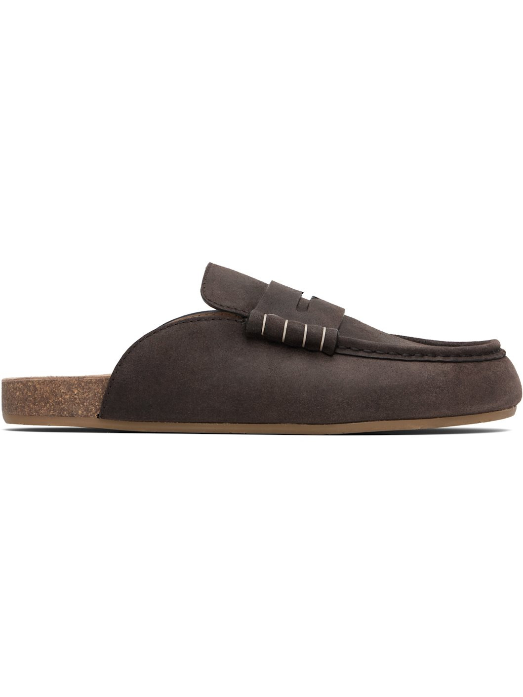 Blistered suede loafers. · Moc toe · Strap with cutout at vamp · Molded suede footbed · Calfskin lining · Cork midsole · Rubber sole · Contrast blanket stitching in white Supplier color: Deep walnut Upper: leather. Sole: cork, rubber. Made in Italy 252477M231006