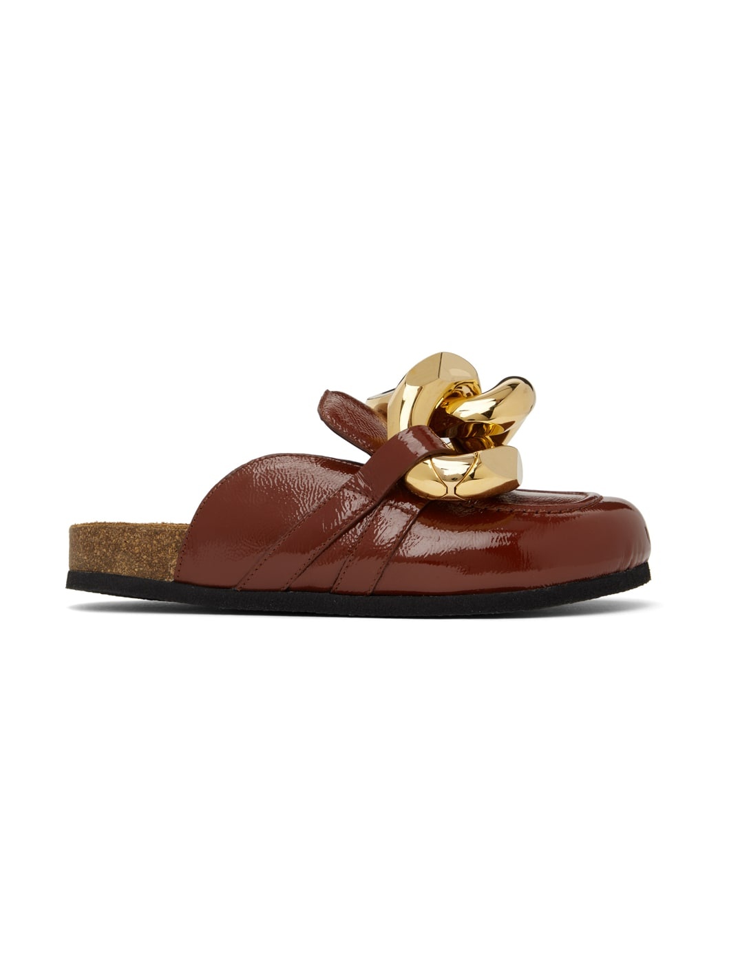 Patent leather slip-on loafers in tan. Signature curb-chain accent at vamp. · Round moc toe · Leather lining · Molded suede footbed · Cork midsole · Textured rubber outsole Supplier color: Rust Upper: leather. Sole: rubber. Made in Italy 231477F121017