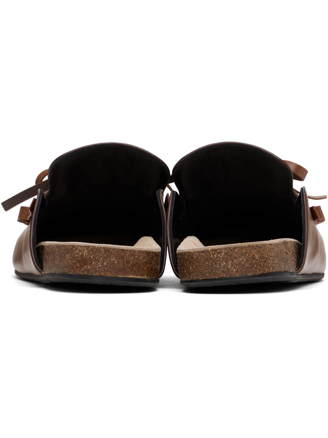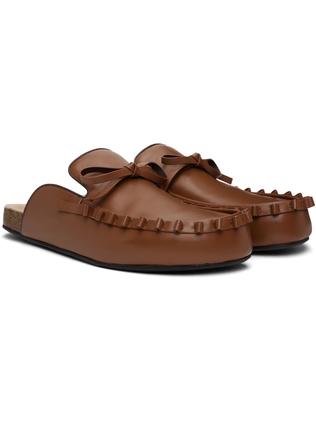 Buffed calfskin slip-on loafers in tan. · Piping in brown throughout · Ruffles at moc toe · Bow accent at vamp · Logo-embossed molded suede footbed · Cork midsole · Treaded rubber sole Supplier color: Tan Upper: calfskin. Sole: cork, rubber. Made in Italy 251477M231015