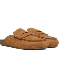 Suede loafers. · Stripes embossed throughout · Moc toe · Strap with cutout at vamp · Molded suede footbed · Calfskin lining · Cork midsole · Rubber sole · Contrast blanket stitching in white Supplier color: Caramel Upper: leather. Sole: cork, rubber. Made in Italy 252477M231005