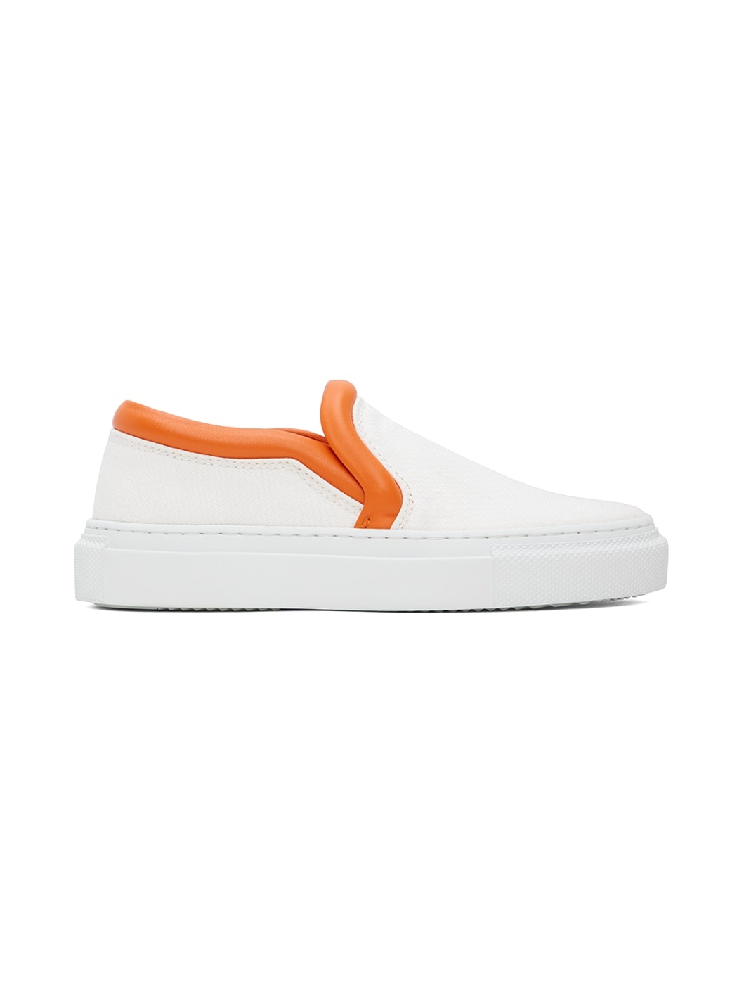 Low-top cotton canvas slip-on sneakers in white. Buffed calfskin trim in orange throughout. · Padded tongue and collar · Buffed calfskin lining · Textured rubber midsole · Treaded rubber outsole Supplier color: White Upper: textile. Sole: rubber. Made in Italy 231477F128004