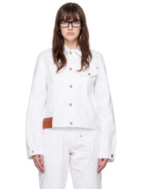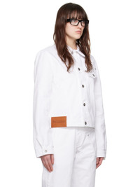 Non-stretch denim jacket. Curved seams throughout. · Asymmetric paneled construction · Spread collar · Button closure · Flap pocket · Leather logo patch at front hem · Single-button barrel cuffs · Logo embroidered at back Supplier color: White