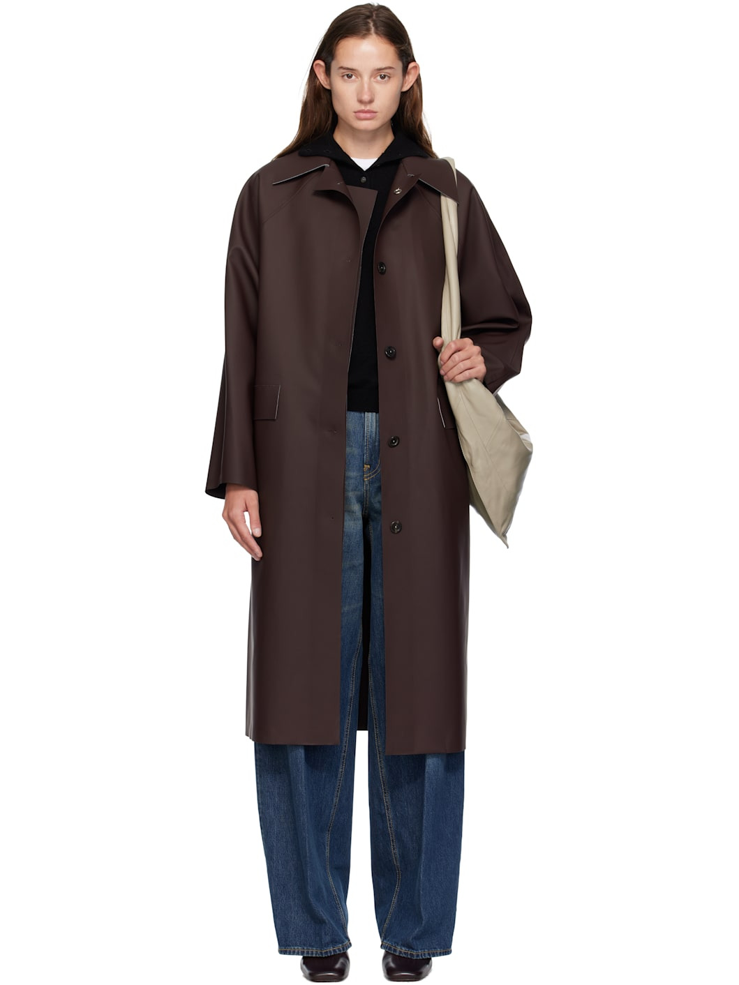 Rubberized jersey coat. · Water-repellent · Spread collar · Button closure · Flap pockets at waist · Raglan sleeves · Vented storm flap at back yoke · Unlined Supplier color: Dark chocolate 52% polyester, 48% polyurethane. Made in Bulgaria 252278F059004