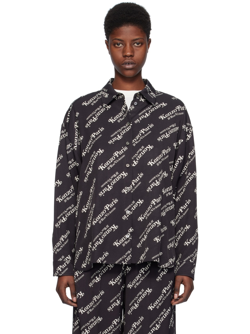 Viscose twill shirt. Logo graphic pattern printed throughout. · Spread collar · Button closure · Shirttail hem · Dropped shoulders · Adjustable single-button barrel cuffs · Logo-engraved mother-of-pearl hardware Part of the Kenzo x Verdy collaboration. Supplier color: Black 100% viscose. Made in Tunisia 241387F109010