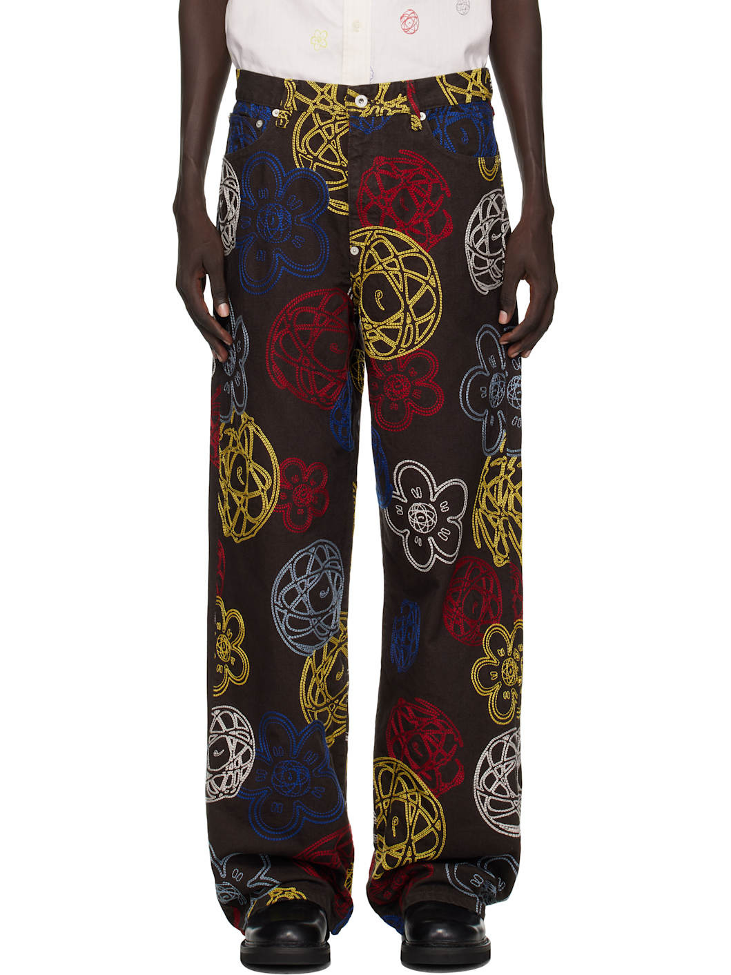 Cotton canvas trousers. · Graphic pattern embroidered throughout · Wide-leg · Belt loops · Five-pocket styling · Zip fly · Logo patch at back waistband · Logo-engraved silver-tone hardware Supplier color: Chocolate 100% cotton. Made in Portugal 252387M191002