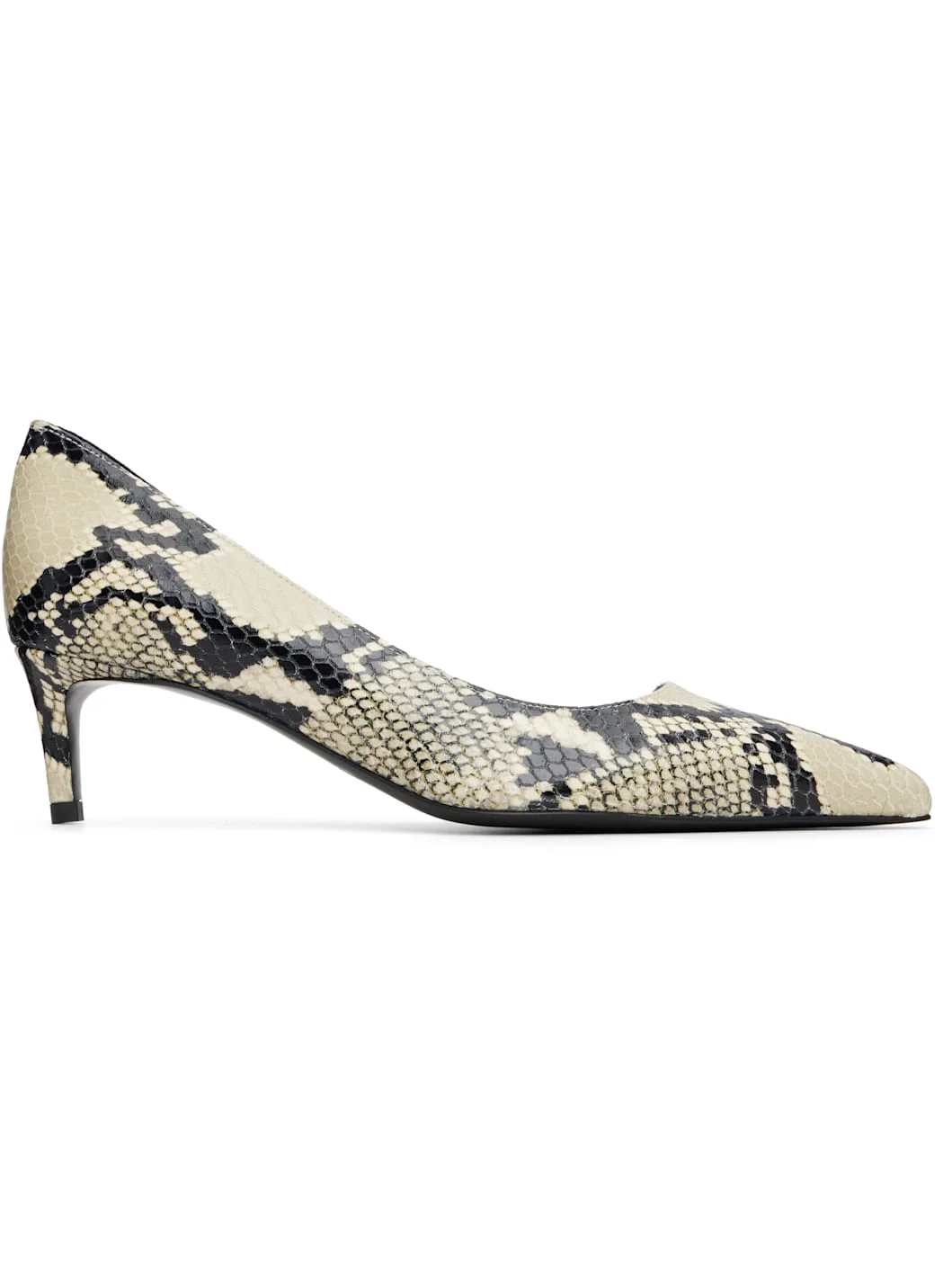 Snakeskin-embossed calfskin heels. · Pointed toe · Cutout at inner side · Concealed elasticized strap at heel collar · Stiletto heel with rubber injection · Calfskin sole · Heel: H1.75" Supplier color: Natural Upper: calfskin. Sole: calfskin, rubber. Made in Italy 252914F122007