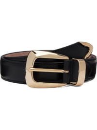 Buffed calfskin belt. · Pin-buckle fastening · Gold-tone hardware · W1" Supplier color: Black leather with gold Calfskin. Made in Italy 252914F001016