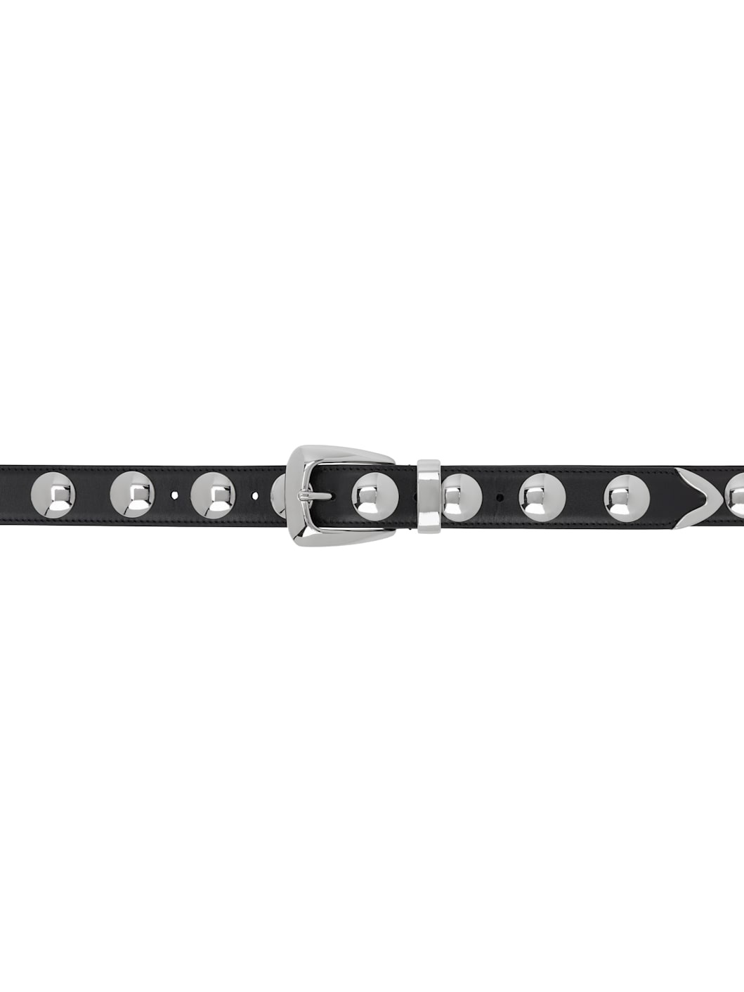 Buffed calfskin belt in black. · Studs throughout · Pin-buckle fastening · Silver-tone hardware · W1" Supplier color: Black Leather. Made in Italy 251914F001006