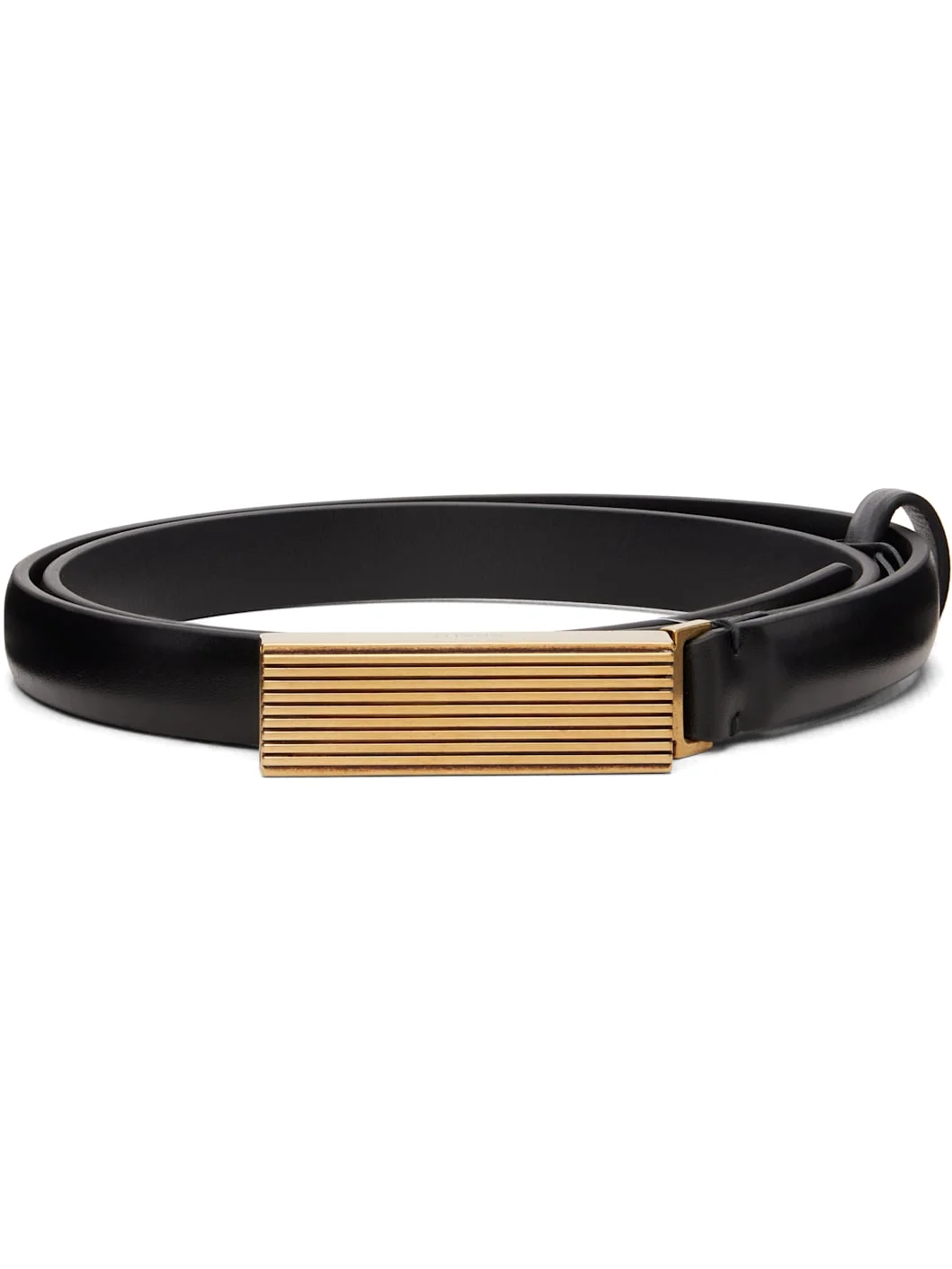 Buffed leather belt. · Keeper loop · Stripe-embossed buckle at pull-through fastening · 18k gold-plated brass hardware · W0.75" Supplier color: Black Leather. Made in Italy 261914F001006