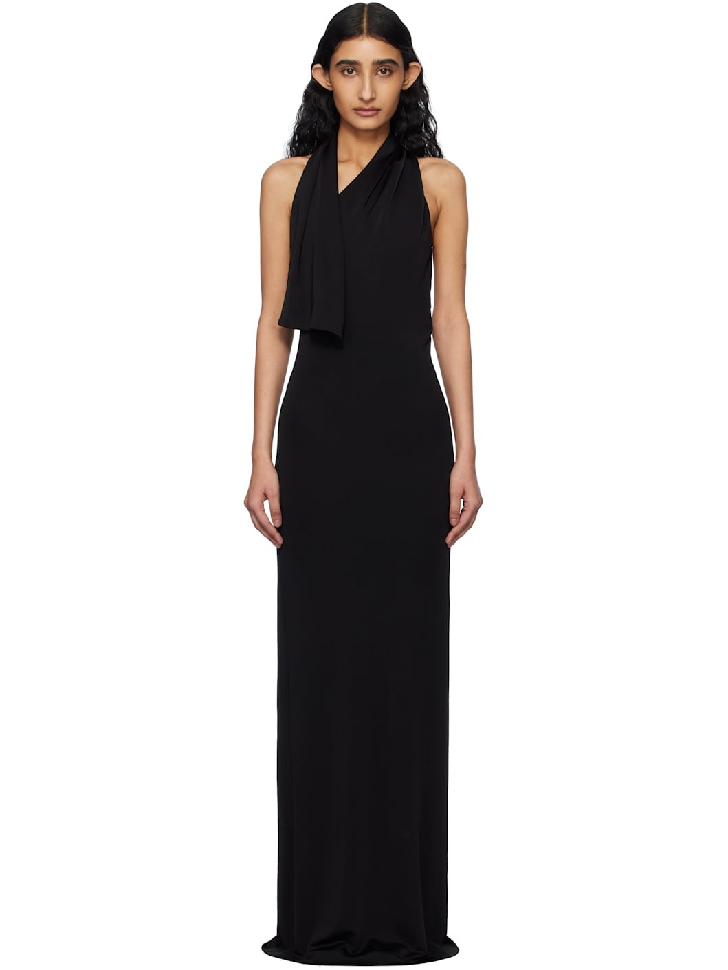 Viscose jersey maxi dress. Draping throughout. - Asymmetric V-neck - Raw edge at hem - Fixed halter strap - Low back - Full viscose jersey lining Supplier color: Black