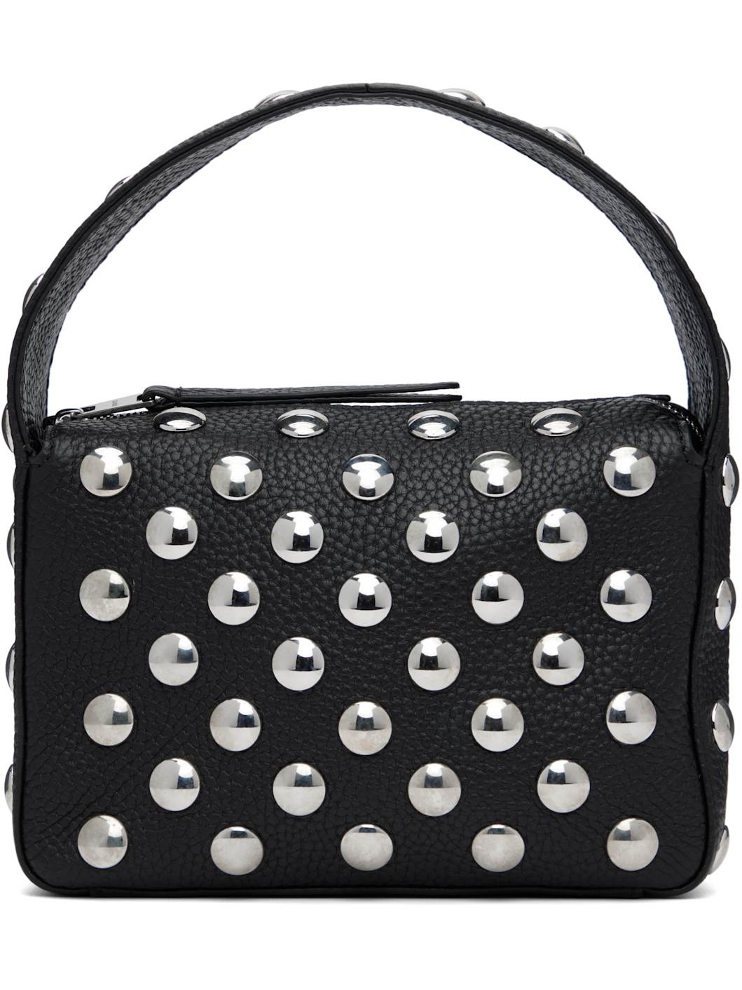 Grained calfskin top handle bag. Mirrored palladium-plated brass studs throughout. · Carry handle · Zip closure · Card slot at interior · Grained leather lining · Silver-tone hardware · H6" x W8" x D3" Supplier color: Black pebbled leather with studs Calfskin. Made in Italy 252914F048013