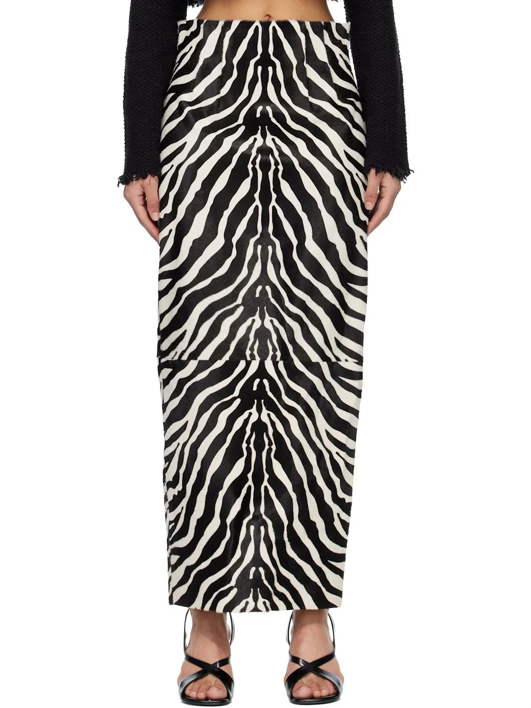Calf-hair maxi skirt. · Zebra pattern printed throughout · High-rise · Darts at waist · Concealed zip closure at back · Central vent at back hem · Stretch silk lining Supplier color: Zebra Print Haircalf Body: 100% calfskin. Trim: 100% lambskin. Lining: 95% silk, 5% lycra. Made in Italy 261914F093000