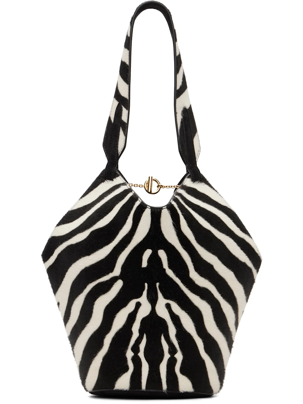 Calf-hair and calfskin suede tote. · Fixed shoulder strap · Graphic pattern printed at face · Logo stamp at back face · Toggle fastening at open throat · Buffed calfskin lining · H10" x W12" x D5" Supplier color: Zebra Print Haircalf and Black Suede Calfskin. Made in Italy 261914F049001