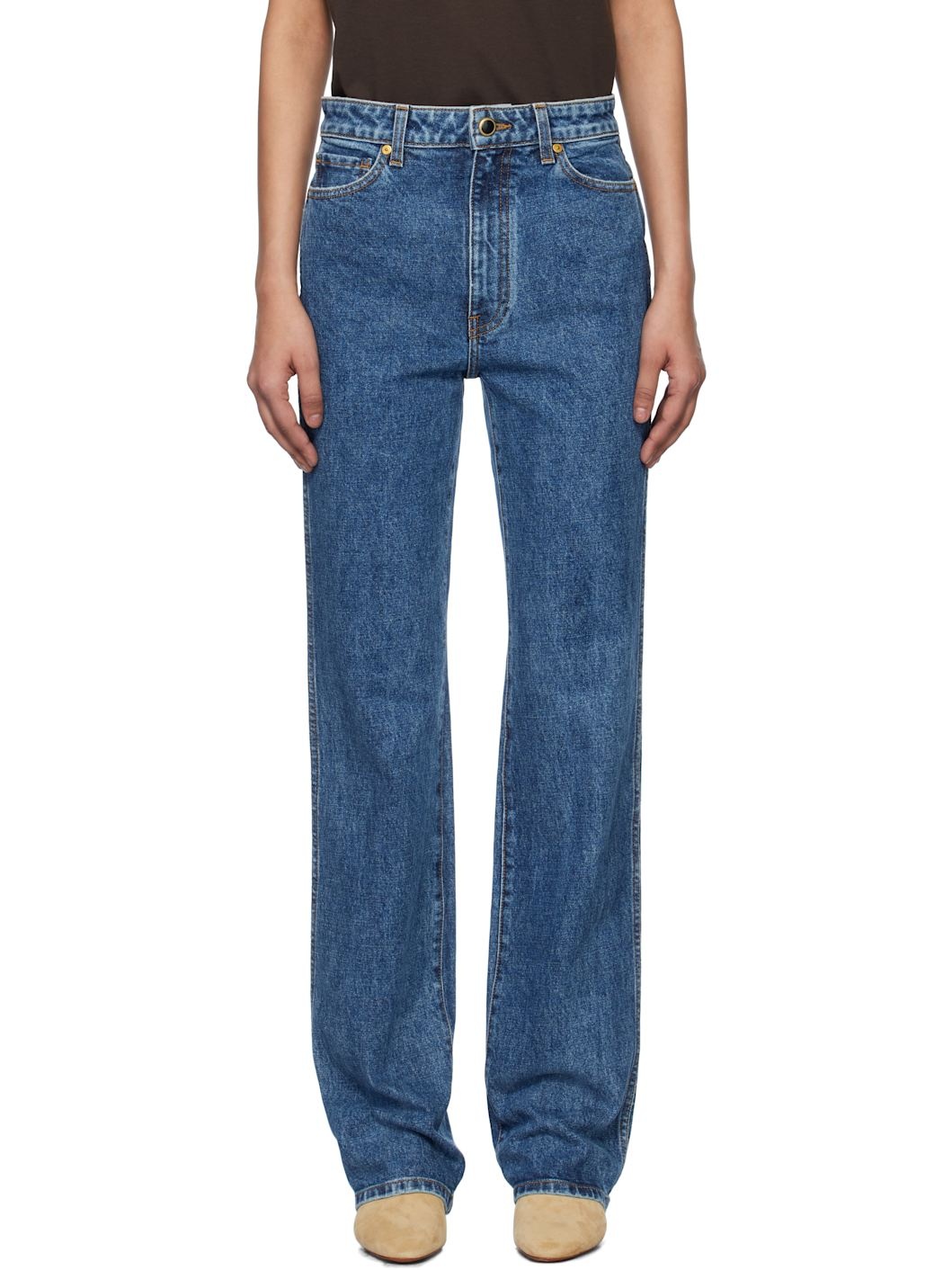 Slim-fit straight-leg stretch denim jeans. Fading and subtle distressing throughout. - High-rise - Belt loops - Five-pocket styling - Button fly - Logo-engraved antiqued gold-tone hardware - Contrast stitching in tan Supplier color: Boone