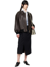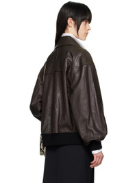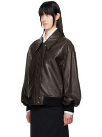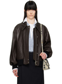 Grained lambskin jacket. · Spread collar · Two-way zip closure with press-stud placket · Seam pockets · Rib-knit wool hem and cuffs · Dropped shoulders · Full twill lining Supplier color: Dark brown leather Body: 100% lambskin. Trim: 100% wool. Lining: 100% cupro. Made in United States 251914F064006