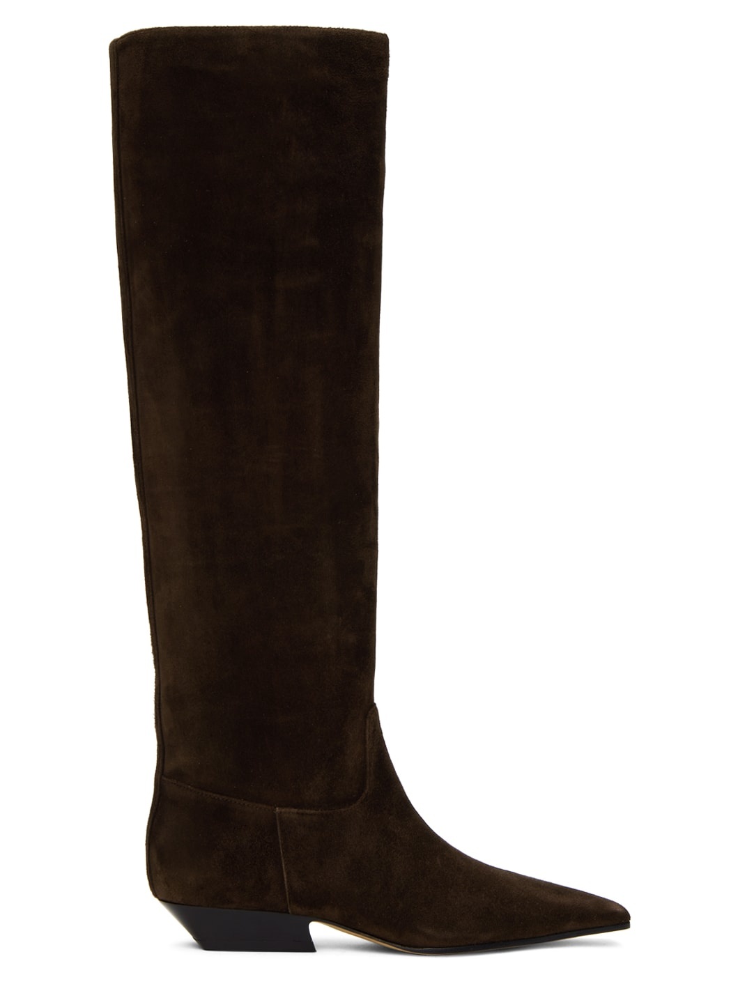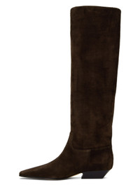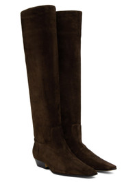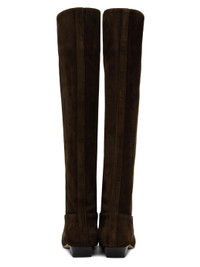 Knee-high calfskin suede boots in brown. · Square toe · Calfskin suede lining · Stacked leather block heel with rubber injection · Leather sole Supplier color: Coffee