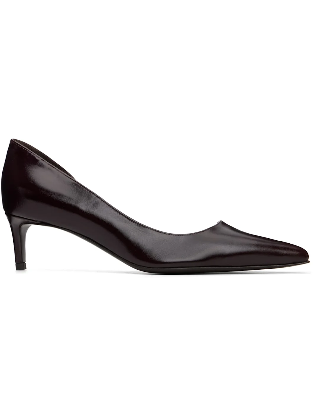 Polished calfskin heels. · Pointed toe · Cutout at inner side · Concealed elasticized strap at heel collar · Stiletto heel with rubber injection · Calfskin sole · Heel: H1.75" Supplier color: Bordeaux Upper: calfskin. Sole: calfskin, rubber. Made in Italy 252914F122006