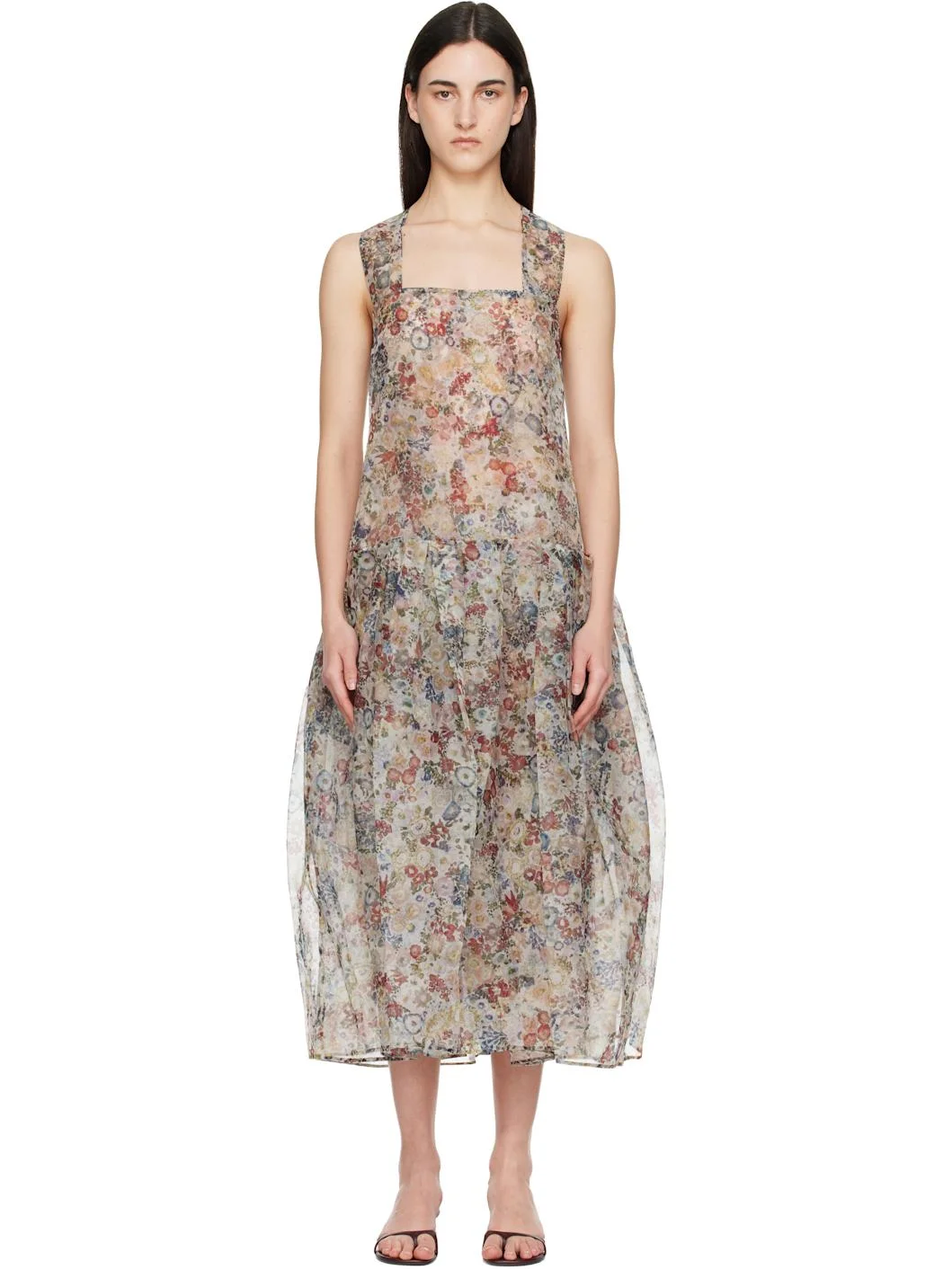 Semi-sheer silk organza maxi dress. · Includes matching silk organza slip · Floral pattern printed throughout · Square neck · Seam pockets at waist · Pleats at skirt · Cutout at back Supplier color: Cream multi 100% silk. Made in United States 261914F055002