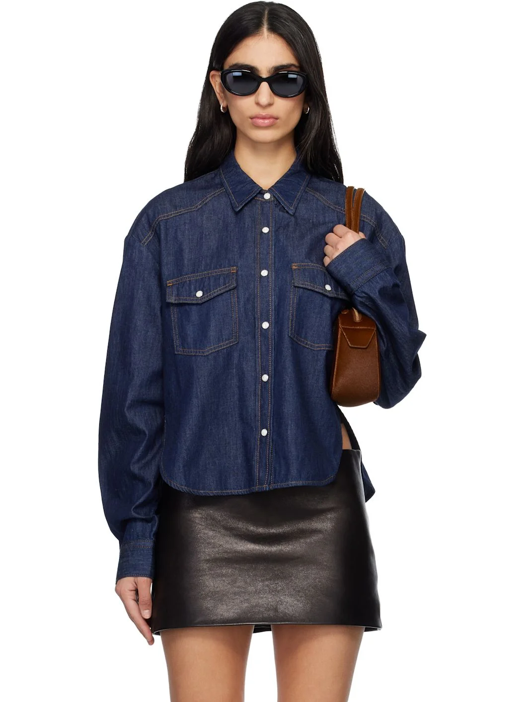 Organic cotton chambray shirt. · Spread collar · Press-stud closure · Western yoke and front and back · Press-stud flap pockets at chest · Cropped shirttail hem · Press-stud barrel cuffs · Contrast stitching in tan Supplier color: Benson 100% organic cotton. Made in United States 261914F109002