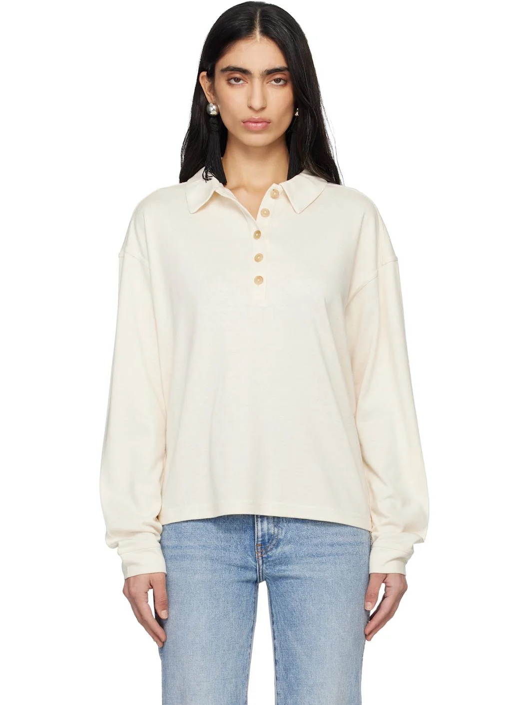 Silk jersey polo. · Salt-shrunk · Spread collar · Five-button placket · Dropped shoulders Supplier color: Cream 100% silk. Made in Portugal 261914F108001
