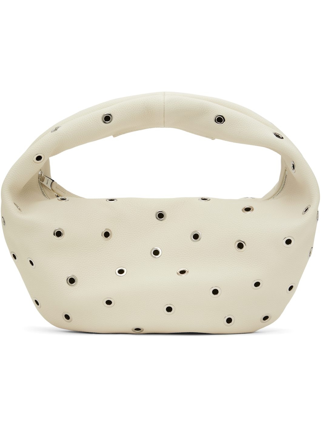 Pebble-grained calfskin shoulder bag in off-white. · Metal grommets throughout · Integrated shoulder strap · Zip closure · Suede lining · H7" x W13.5" x D4" · Total height: H11" Supplier color: Dark ivory pebbled leather with grommets Calfskin. Made in Italy 251914F048002