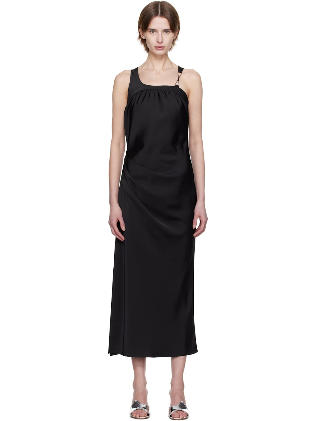 Polyester satin maxi dress. · Gathering at asymmetric neck · Slit at hem · Pleats at side seam · Lace-up detailing at back Supplier color: Black 100% polyester. Made in South Korea 251586F055001