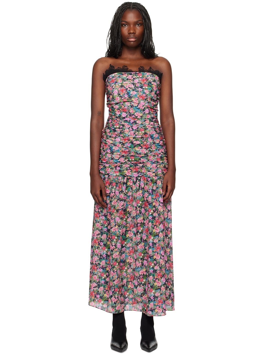 Polyester chiffon maxi dress. Printed floral pattern and ruching throughout. · Lace trim at sweetheart neck · Gathering at dropped waist · Zip closure at back · Partial satin lining Supplier color: Green garden 100% polyester. Made in Colombia 251593F055002