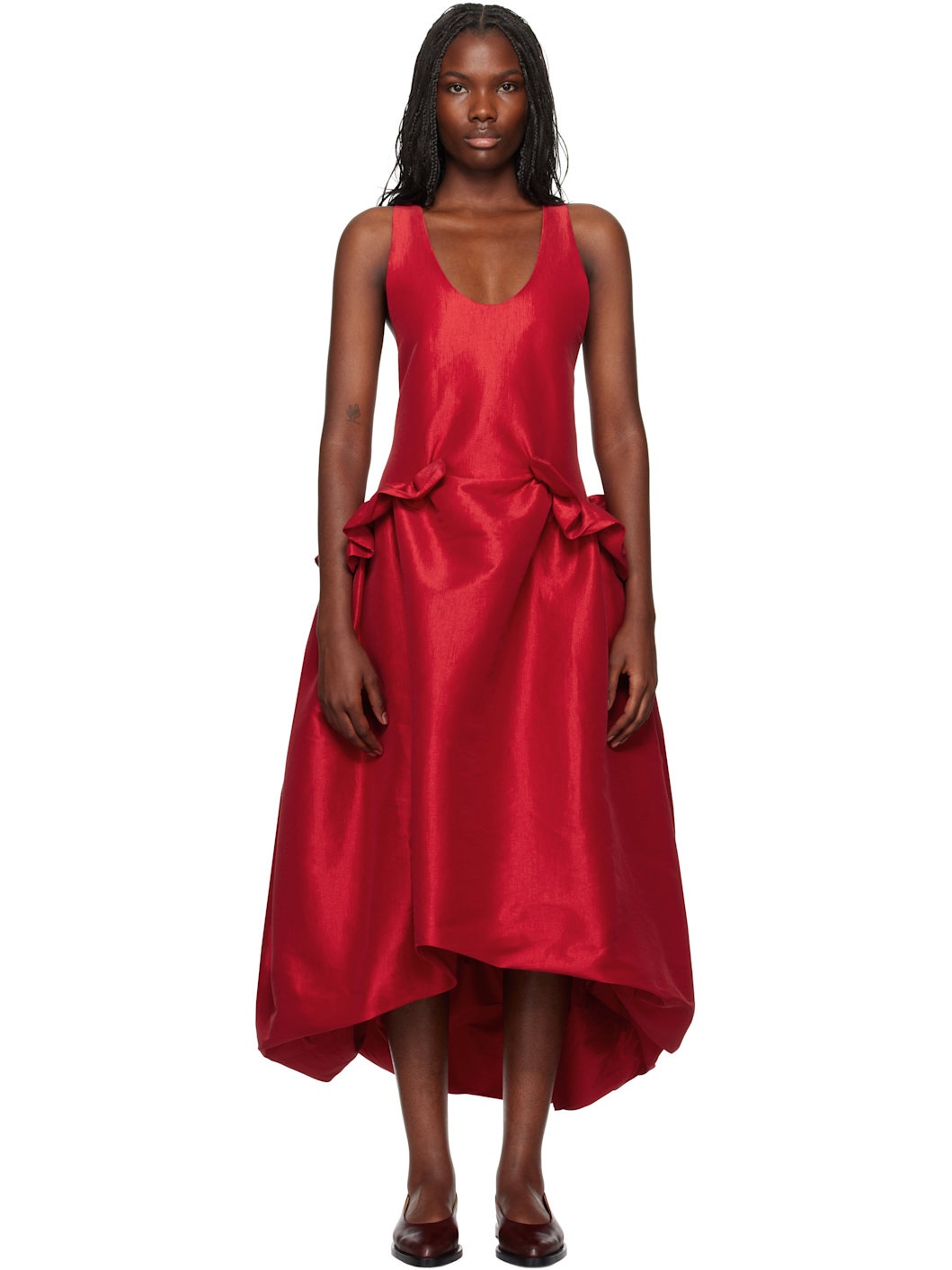 Stretch polyester-blend taffeta midi dress. · Scoop neck · Gathering and ruffles at waist · Low back · Droptail bubble hem · Full stretch satin lining Available exclusively at SSENSE. Supplier color: Red Body: 65% polyester, 30% nylon, 5% elastane. Lining: 97% polyester, 3% elastane. Made in Colombia 251593F054004