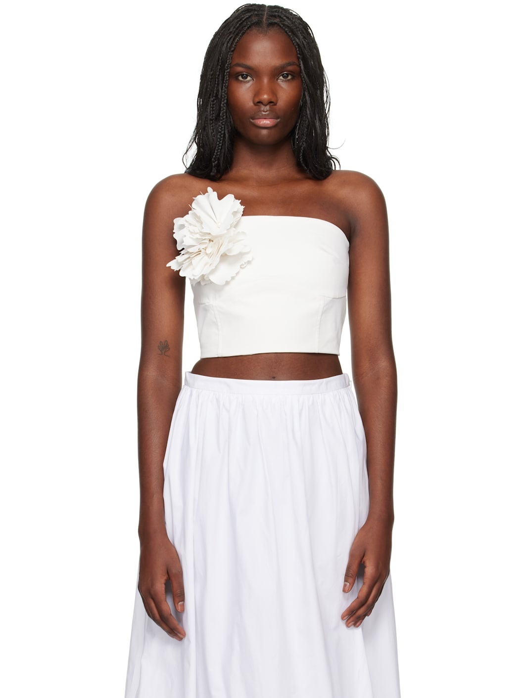 Polyester twill bandeau top. · Floral applique at straight neck · Darts at chest · Zip closure and boning at back · Unlined Available exclusively at SSENSE. Supplier color: All white 100% polyester. Made in Colombia 251593F111001