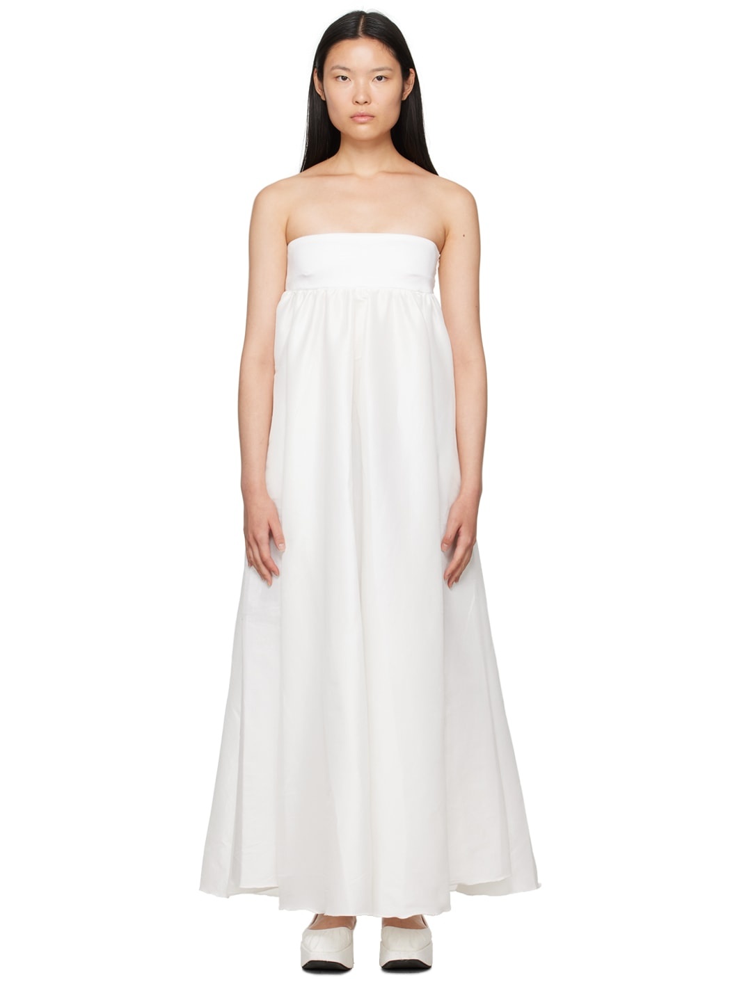 Stretch polyester- and nylon-blend taffeta dress. · Straight neck · Gathering at chest · Flared hem · Zip closure at side seam · Tiered trim at back · Unlined Available exclusively at SSENSE. Supplier color: White 65% polyester, 30% nylon, 5% elastane. Made in Colombia 232593F055000