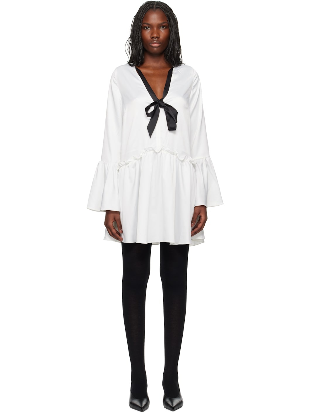 Stretch polyester satin minidress. · Self-tie bow at plunging V-neck · Darts at front · Ruffles at waist · Flared cuffs Available exclusively at SSENSE. Supplier color: White 96% polyester, 4% elastane. Made in Colombia 251593F052010