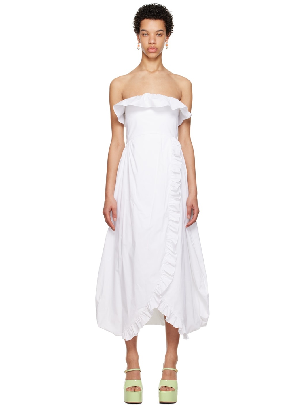 Stretch cotton poplin dress. Ruffled trim throughout. · Off-the-shoulder and asymmetrical construction · Straight neck · Pleats at waist · Lapped vent at hem · Seam pockets · Concealed zip closure at back Supplier color: White 97% cotton, 3% elastane. Made in Colombia 232593F054003