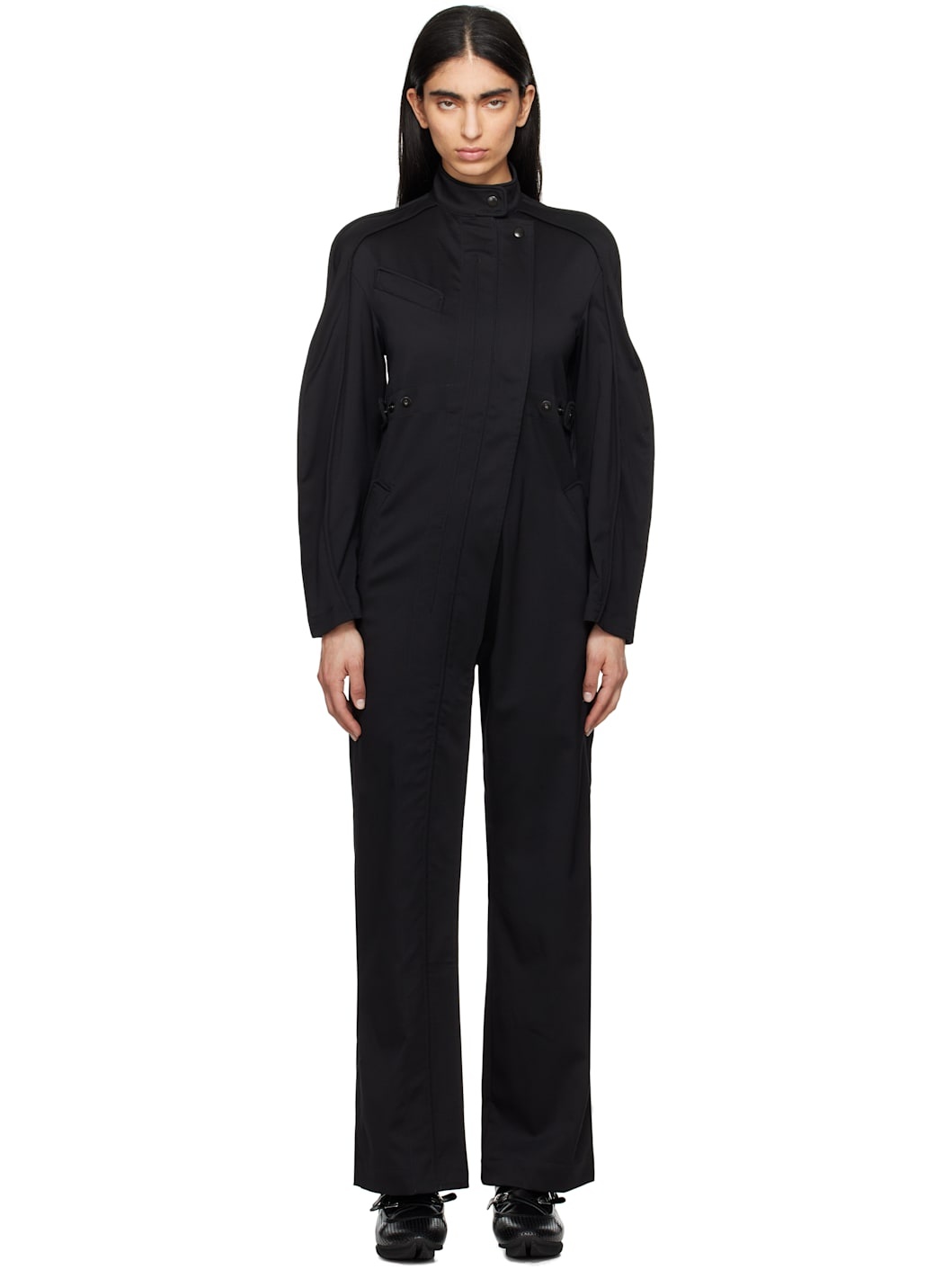 Straight-leg stretch virgin wool twill jumpsuit. Piping throughout. · Press-stud tab at stand collar · Concealed offset two-way zip closure extends to cuff · Press-stud placket at front · Welt pocket at chest · Adjustable press-stud tabs at waist · Three-pocket styling · Pinched seams at saddle shoulders and sleeves · Darts at back Supplier color: Night black 98% virgin wool, 2% elastane. Made in Bulgaria 251985F070000