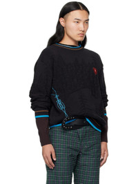 Knit recycled-blend cotton sweater. · Reverse-knit pattern throughout · Striped rib-knit crewneck, hem, and cuffs · Embroidered logo patch at chest · Graphic embroidered at side seams Supplier color: Black/Cerulean/Russet brown 60% cotton, 40% recycled cotton. Made in Bulgaria 252985M201002