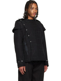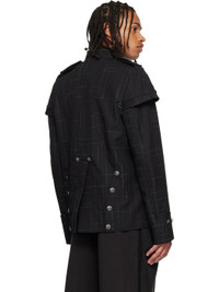 Virgin wool-blend barathea blazer. · Check pattern throughout · Stand collar · Offset button closure · Graphics embroidered at front · Seam pockets at waist · Epaulets · Padded shoulders · Integrated layered long sleeves · Buttons at cuffs · Central vent and twin button vents at back hem · Welt pockets at interior · Full satin lining · Logo-engraved silver-tone hardware Supplier color: Space check/Night black Body: 98% virgin wool, 1% polyester, 1% polyamide. Trim 1: 98% virgin wool, 2% elastane. Trim 2: 100% cotton. Lining: 100% viscose. Made in Bulgaria 252985M195004