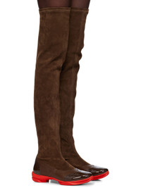 Over-the-knee calfskin suede and nappa leather boots in brown. · Perforated detailing and serrated edges throughout · Patent leather trim at toe and heel counter · Zip closure at inner side · Twill lining · Treaded rubber sole Supplier color: Chocolate brown/Chestnut Upper: calfskin, leather. Sole: rubber. Made in Italy 242985F115001